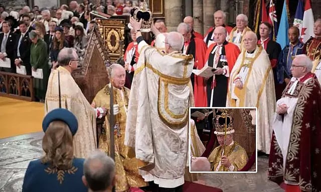 அதன்படி லண்டனில் உள்ள வெஸ்ட்மின்ஸ்டர் அபே தேவாலயத்தில் நேற்று இந்த விழா கோலாகலமாக நடைபெற்றது. காலை 11 மணியளவில் சார்லஸ் மன்னராக முடிசூட்டப்பட்டார். பேராயர், செயின்ட் எட்வர்டின் கிரீடத்தை மன்னர் சார்லசுக்கு அணிவித்தார்.