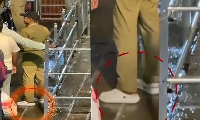 இந்தநிலையில், கோவிலின் சன்னிதானத்திற்கு அருகில் பாதுகாப்பு பணியில் ஈடுபட்டிருந்த ராஜேஷ் என்ற போலீஸ் அதிகாரி, காலில் காலணி அணிந்து கொண்டு நின்றார். இதனை செல்போனில் வீடியோ எடுத்த பக்தர்கள் சிலர், அதனை சமூகவலைதளங்களில் வெளியிட்டனர். சபரிமலையின் புனிதத்தை மீறியதாக போலீஸ் அதிகாரி மீது குற்றம் சாட்டப்பட்டது.