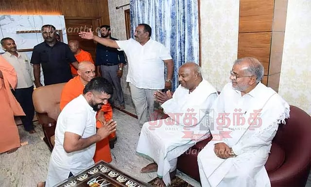 இந்த நிலையில், முன்னாள் பிரதமர் எச்.டி.தேவேகவுடா நேற்று முன்தினம் மைசூருவில் உள்ள ஆதிசுஞ்சனகிரி மடத்துக்கு சென்றார். அப்போது அவரை சந்தித்து மைசூரு-குடகு தொகுதி பா.ஜனதா எம்.பி. பிரதாப் சிம்ஹா பேசினார். அந்த சமயத்தில், பிரதாப் சிம்ஹா எம்.பி. எச்.டி.தேவேகவுடாவின் காலில் விழுந்து வணங்கி ஆசி பெற்றார். இதுதொடர்பான படங்களை தன்னுடைய டுவிட்டர் பக்கத்தில் பிரதாப் சிம்ஹா வளியிட்டுள்ளார். இந்த சந்திப்பின்போது சாமுண்டீஸ்வரி தொகுதி ஜனதாதளம்(எஸ்) எம்.எல்.ஏ. ஜி.டி.தேவேகவுடாவும் உடன் இருந்தார்.