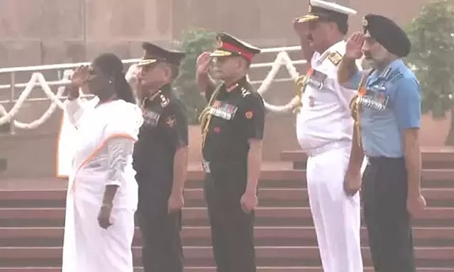 ஜனாதிபதி திரவுபதி முர்முவுடன் முப்படை தளபதிகளும் மரியாதை செலுத்தினர். அவர்களை தொடர்ந்து மத்திய பாதுகாப்பு மந்திரி ராஜ்நாத் சிங், இணை மந்திரி சஞ்சய் சேத் ஆகியோரும் மரியாதை செலுத்தினர்.