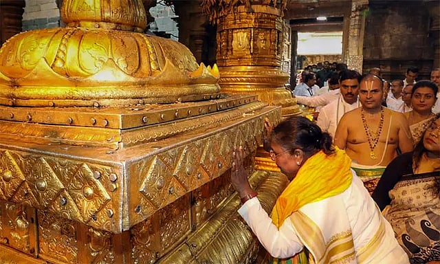 இதையடுத்து திருப்பதி வந்த ஜனாதிபதி பத்மாவதி விருந்தினர் மாளிகையில் தங்கினார். இன்று காலை 9.25 மணிக்கு வராஹ சாமி கோவிலிலும், பின்னர் 9.30 மணிக்கு ஏழுமலையான் கோவிலிலும் சாமி தரிசனம் செய்தார். மகா துவாரம் வழியாக தரிசனத்திற்கு சென்ற அவருக்கு கோவில் நிர்வாகம் சார்பில் சிறப்பான வரவேற்பு அளிக்கப்பட்டது. அவருடன் மத்திய சுற்றுலாத்துறை மந்திரி ஜி கிஷன் ரெட்டி, மாநில மந்திரிகள் மற்றும் அதிகாரிகள் உடனிருந்தனர்.