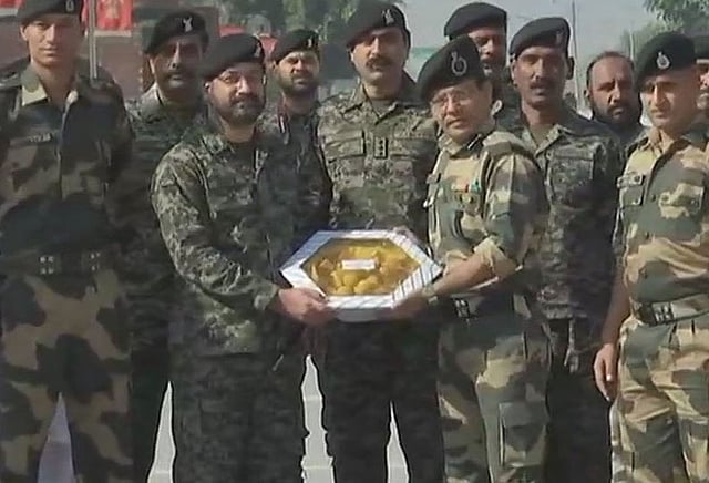 தீபாவளி உள்ளிட்ட முக்கிய பண்டிகைகளின் போது, வாகா எல்லையில் பணியாற்றும் இந்தியா - பாகிஸ்தான் வீரர்கள் பரஸ்பரம் இனிப்புகள் பரிமாறிக்கொள்வது வழக்கம். அந்த வகையில், இந்த ஆண்டு தீபாவளி பண்டிகையை முன்னிட்டு பாகிஸ்தான் வீரர்களுக்கு இனிப்புகள் வழங்கி, இந்திய வீரர்கள் தங்கள் கொண்டாட்டத்தை வெளிப்படுத்தினர்.