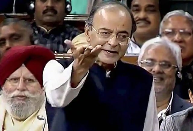 அருண் ஜெட்லி பேசிக் கொண்டிருந்தபோது, காங்கிரஸ் எம்.பி.க்கள் சிலர் காகிதத்தில் விமானம் செய்து, அதை அருண் ஜெட்லியை நோக்கி வீசினர்.