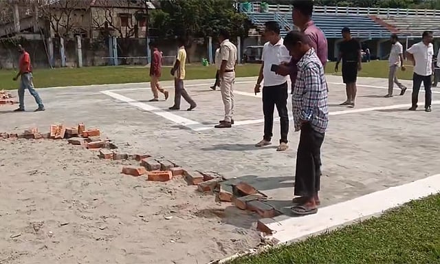 இதுதொடர்பாக போலீசில் காங்கிரஸ் சார்பில் புகார் அளிக்கப்பட்டது. ஆனால், தங்கள் மீது களங்கம் விளைவிப்பதற்காக காங்கிரசாரே ஹெலிகாப்டர் தளத்தை சிதைத்ததாக திரிணாமுல் காங்கிரசின் ராய்கஞ்ச் நகர தலைவர் ஷிப்சங்கர் ரே குற்றம் சாட்டியுள்ளார். ஹெலிகாப்டர் தளத்தை சீரமைக்கும் பணி நடந்து வருகிறது.