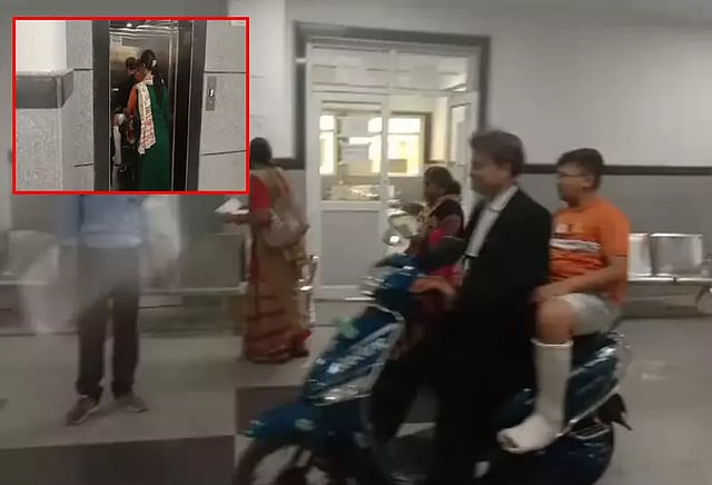 இதுபற்றி மருத்துவமனை நிர்வாகத்தின் துணை கண்காணிப்பாளர் கர்னேஷ் கோயல் கூறும்போது, மனோஜின் ஸ்கூட்டரை வாசல் பகுதி வரை செல்லவே அனுமதி அளிக்கப்பட்டு இருந்தது. ஆனால், அவர் மருத்துவமனையின் லிப்டுக்குள் தனது மகனுடன் ஸ்கூட்டரை ஓட்டி சென்றுள்ளார் என தெரிவித்து உள்ளார்.