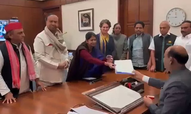 அவருடன் காங்கிரஸ் கட்சியின் பொதுச் செயலாளர் பிரியங்கா காந்தி, சமாஜ்வாடி கட்சி தலைவர் அகிலேஷ் யாதவ், திமுக பொருளாளர் டி. ஆர். பாலு எம்.பி, இந்தியா கூட்டணி எம்.பிக்கள் உள்ளிட்டோர் உடனிருந்தனர்.
