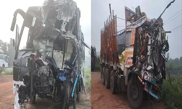 கர்நாடகாவின் கோலாப்பூரில் இருந்து பெங்களூர் நோக்கி பேருந்து ஒன்று சென்று கொண்டிருந்தது. நள்ளிரவு 1 மணியளவில் டிராக்டர் ஒன்றை முந்தி செல்ல முயன்றபோது, தார்வாத் நோக்கி சென்று கொண்டிருந்த எதிரே வந்த லாரி ஒன்றின் மீது மோதியது.