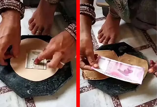 அதன்பின் அதனை நன்றாக தவாவில் போட்டு சூடுபடுத்துகிறார். எண்ணெய் ஊற்றுகிறார். பின்பு புரோட்டா சாப்பிட தயாரானதும் அதனை, எடுத்து தட்டில் வைக்கிறார். புரோட்டாவை பிரித்து உள்ளே இருந்து ரூ.500 நோட்டுக்கு பதிலாக புதிதாக உள்ள ரூ.2 ஆயிரம் நோட்டு ஒன்றை எடுத்து காண்பிக்கிறார்.