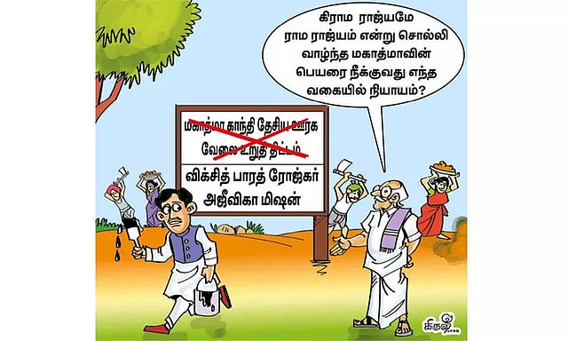 தினக்கூலியாக ரூ.100 கொடுக்கப்பட்ட தொகை அடுத்தடுத்த ஆண்டுகளில் உயர்த்தப்பட்டு கொண்டே வந்தது. அந்தவகையில், தமிழ்நாட்டில் இப்போது மத்திய அரசு தினமும் ரூ.336 வழங்கி வருகிறது. இந்த தொகை மாநிலத்துக்கு மாநிலம் வேறுபடுகிறது. அண்டை மாநிலங்களான கேரளாவில் ரூ.369, கர்நாடகாவில் ரூ.370, ஆந்திரா மற்றும் தெலுங்கானாவில் ரூ.307 என்று நிர்ணயிக்கப்பட்டுள்ளது. இத்தகைய சூழ்நிலையில், இந்த திட்டத்தின் பெயரில் இருந்து செயலாக்கம் வரை பல மாற்றங்களை அமல்படுத்தும் வகையில் ஒரு மசோதாவை மத்திய அரசு நாடாளுமன்றத்தில் தாக்கல் செய்துள்ளது. இதன்படி, இந்த திட்டத்துக்கு மகாத்மா காந்தியின் பெயர் நீக்கப்பட்டு விக்சித் பாரத் ரோஜ்கர் அஜீவிகா மிஷன் (கிராமின்), அதாவது வளர்ந்த பாரத வேலைவாய்ப்பு மற்றும் வாழ்வாதார ஊரக உறுதி அளிப்பு திட்டம் என்று பெயர் மாற்றப்பட்டுள்ளது.