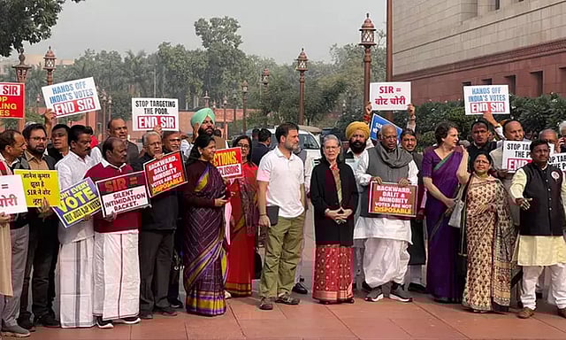 இதன்படி, காங்கிரஸ் எம்.பி. சோனியா காந்தி, மக்களவை எதிர்க்கட்சி தலைவர் ராகுல் காந்தி மற்றும் மாநிலங்களவை எதிர்க்கட்சி தலைவர் மற்றும் காங்கிரஸ் கட்சியின் தேசிய தலைவரான மல்லிகார்ஜுன கார்கே, தி.மு.க. எம்.பி.க்கள் கனிமொழி, டி.ஆர். பாலு உள்ளிட்ட எதிர்க்கட்சி தலைவர்கள் நாடாளுமன்ற வளாக பகுதிகளில் நின்றபடி எஸ்.ஐ.ஆர். விவகாரத்தில் கோஷம் எழுப்பியபடி ஆர்ப்பாட்டத்தில் ஈடுபட்டனர்.