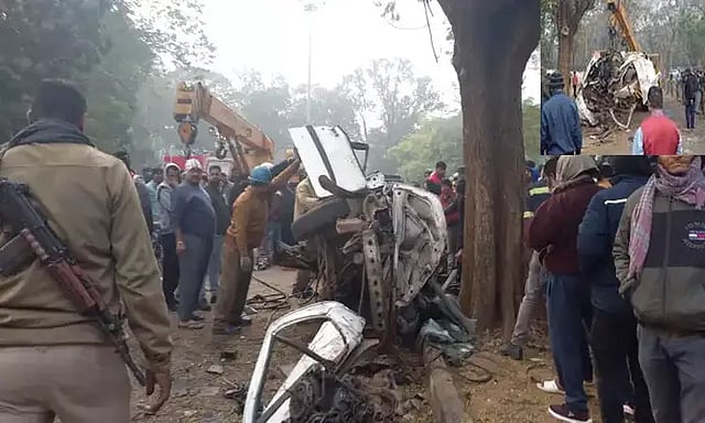 அதிகாலை 5 மணியளவில் அதிவேகமாக சென்றபோது கட்டுப்பாட்டை இழந்த கார் சாலையின் தடுப்புச்சுவர் மீது மோதியது. இந்த கோர விபத்தில் காரில் பயணித்த 5 பேர் சம்பவ இடத்திலேயே உயிரிழந்தனர்.