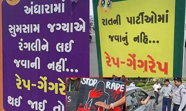 அகமதாபாத் போக்குவரத்து போலீஸ் சார்பில் ஒட்டப்பட்ட அந்த போஸ்டர்களில், நள்ளிரவு நேரங்களில் நடைபெறும் பார்ட்டிகளில் பங்கேற்காதீர்கள், நீங்கள் பாலியல் வன்கொடுமை அல்லது கூட்டு பாலியல் வன்கொடுமை செய்யப்படலாம். இருட்டான ஆள்டமாட்டமற்ற பகுதிகளுக்கு பெண் நண்பர்களை ஆண் நண்பர்கள் அழைத்து செல்ல வேண்டாம்.