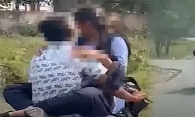 டூவீலரை அந்த நபர் ஓட்ட, பெட்ரோல் டேங்க் மீது அமர்ந்திருந்த மாணவி, அவரை கட்டிப்பிடித்தபடி பயணித்துள்ளார். இருவரும் ரொமான்ஸ் செய்துகொண்டே சிறிது தூரம் வரை வேகமாகச் செல்ல, சாலையில் பயணித்தவர்களின் கவனம் இவர்கள் மேல் விழுந்துள்ளது.