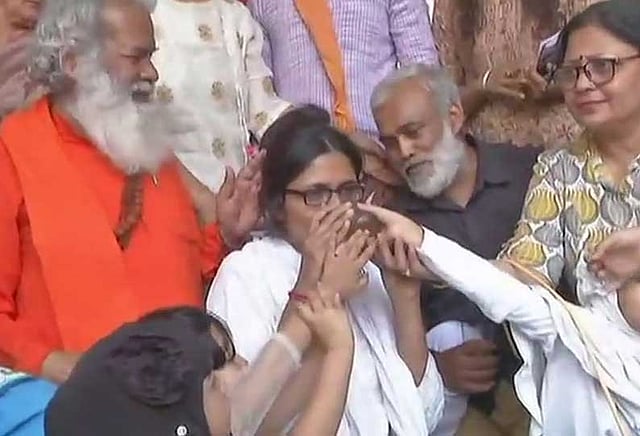 இதை தொடர்ந்து டெல்லி ராஜ்காட்டில் 10 நாட்களுக்கும் மேலாக உண்ணாவிரதம் இருந்து வந்த ஸ்வாதி மாலிவால் தனது போராட்டத்தை முடித்துக்கொண்டார்.