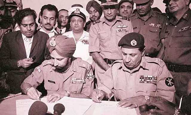 இறுதியில் டிசம்பர் 16-ந் தேதி அன்று டாக்காவில், பாகிஸ்தானின் கிழக்கு பகுதி ராணுவ தளபதி அமீர் அப்துல்லா கான் நியாஸி தலைமையில் 93 ஆயிரம் பாகிஸ்தான் வீரர்கள், இந்திய ராணுவத்தின் லெப்டினென்ட் ஜெனரல் ஜெக்ஜித்சிங் அரோரா தலைமையிலான கூட்டு படைகளிடம் சரண் அடைந்தனர். இதைத்தொடர்ந்து இந்திரா காந்தி போர் நிறுத்தத்தை அறிவித்தார். 13 நாட்களிலேயே முடிந்த போராக இருந்தாலும் இது வரலாற்று முக்கியத்துவம் வாய்ந்ததாக அமைந்தது. போரில் கைப்பற்றிய பகுதிகளை பாகிஸ்தானிடமே திருப்பி கொடுத்து, மனிதாபிமானத்தின் உச்சியில் சிம்மாசனம் போட்டு அமர்ந்தது இந்தியா. இது உலக அரங்கில் இந்தியாவின் மாண்பை அதிகரிக்கச்செய்தது. இந்தியாவில் இருந்து பிரிந்து சென்ற பாகிஸ்தான் துண்டாக பிளந்து, வங்காளதேசம் என்ற தனி நாடு உதயமானது.