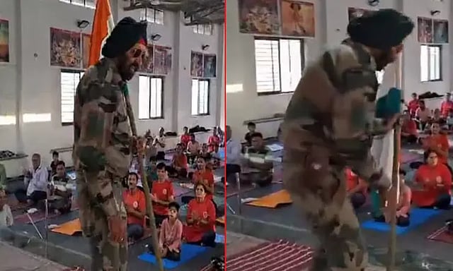 மத்திய பிரதேச மாநிலம் இந்தூரை சேர்ந்தவர் பல்வீர் சிங் சப்ரா. முன்னாள் ராணுவ வீரரான இவர் இந்தூரில் உள்ள பூட்டி கோட்டி என்ற பகுதியில் பல்வீர் சிங் யோகா பயிற்சி வழங்கி வந்துள்ளார். பயிற்சிக்கு இடையில், பல்வீர் சிங் ராணுவ உடையில் தனது கையில் தேசிய கொடியை ஏந்தியபடி தேச பக்தி பாடல்களுக்கு பாடியபடி நடனம் ஆடினார்.