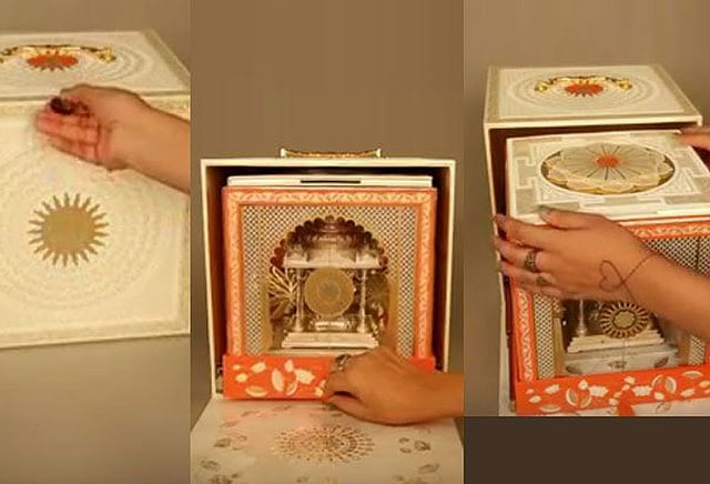 இந்த நிலையில் பெரிய பரிசு பெட்டி போன்ற வடிவத்தில் அழைப்பிதழ் தயார் செய்யப்பட்டுள்ளது . பெட்டியின் உள்ளே விநாயகர் இருப்பது போல வடிவமைக்கப்பட்ட இந்த அழைப்பிதழ் சமூக வலைத்தளங்களில் வேகமாக பரவி வருகிறது. ஒரு அழைப்பிதழ் தயாரிக்க மட்டும் சுமார் ஒரு லட்ச ரூபாய்க்கு மேல் செலவாகியிருக்கலாம் என கூறப்படுகிறது. முன்னதாக அம்பானியின் குடும்பத்தினர் கோயிலுக்கு சென்று அழைப்பிதழை சுவாமியிடம் வைத்து வழிபாடு நடத்தினர்.