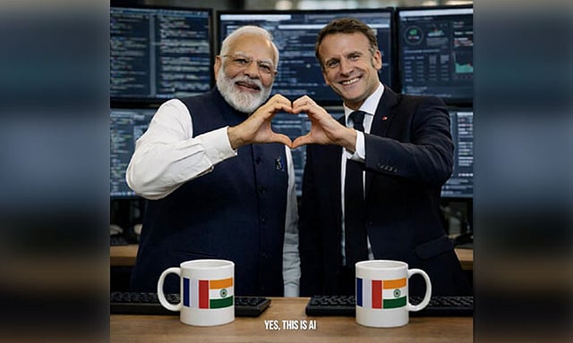 இந்நிலையில், ஏ.ஐ. உருவாக்கிய புகைப்படம் ஒன்றை பிரான்ஸ் ஜனாதிபதி மேக்ரான் சமூக ஊடகத்தில் பகிர்ந்துள்ளார். அதில், பிரதமர் மோடியுடன் பிரான்ஸ் ஜனாதிபதி ஒன்றாக நிற்பது போன்ற காட்சி உள்ளது. அது தற்போது வைரலாகி வருகிறது.
