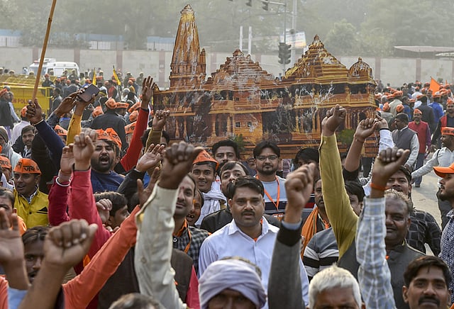 அப்போது நிர்மோஹி அஹாரா அமைப்பைச் சேர்ந்த சாமியார் ராம்ஜி தாஸ், அயோத்தியில் ராமர் கோவில் கட்டும் தேதியை பிரயாக் ராஜ் (அலகாபாத்) நகரில் ஜனவரி மாதம் 15-ந் தேதி தொடங்கி மார்ச் 4-ந் தேதி வரை நடைபெறும் கும்பமேளாவில் அறிவிப்போம் என்றார்.