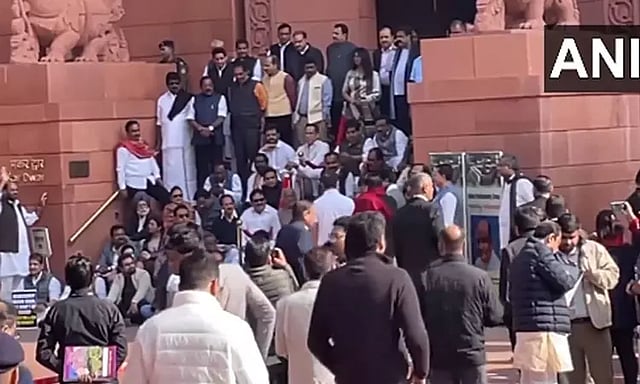 எம்.பி.க்கள் சஸ்பெண்டுக்கு எதிர்ப்பு தெரிவித்து, தேசியவாத காங்கிரசின் சரத் பவார் மற்றும் காங்கிரஸ் கட்சியின் மல்லிகார்ஜுன கார்கே உள்ளிட்ட எதிர்க்கட்சி எம்.பி.க்கள் நாடாளுமன்ற வளாகத்தில் இருந்த காந்தி சிலையின் முன் இன்று போராட்டத்தில் ஈடுபட்டனர். இந்நிலையில், அவையில் எம்.பி.க்கள் மீண்டும் இன்று அமளியில் ஈடுபட்டனர்.