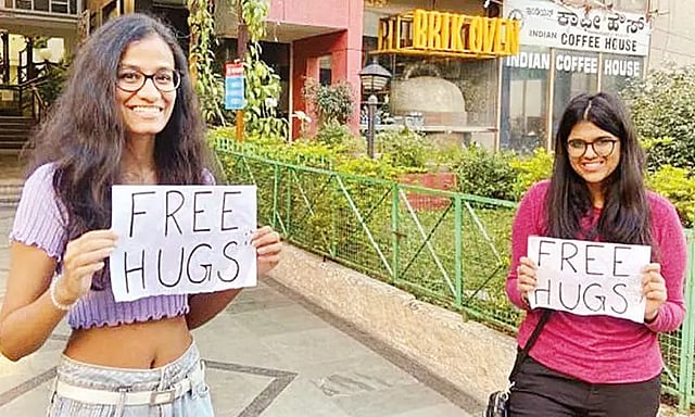 அதாவது பெங்களூருவை சேர்ந்தவர்கள் அபூர்வ அகர்வால் (வயது 19) மற்றும் தனிஷா பரஸ்ராம்கா (22).இவர்கள் 2 பேரும் பெங்களூருவில் உள்ள தனியார் கல்லூரி ஒன்றில் படித்து வருகின்றனர். அவர்கள் 2 பேரும் சர்ச் தெருவில், கைகளில் 'ப்ரீ ஹக்ஸ்' என்ற ஒரு பதாகை ஏந்தியபடி நின்று அவர்களை கடந்து செல்பவர்கள் பலரையும் கட்டிப்பிடித்து வருகின்றனர்.