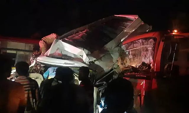 கர்நாடக மாநிலம் ஹசன் மாவட்டத்தின் பனவாரா அருகே நேற்று இரவு 11 மணி அளவில் 20-க்கும் மேற்பட்டவர்களை ஏற்றிக் கொண்டு வேன் ஒன்று அந்த சாலையில் வந்து கொண்டிருந்தது. அப்போது, அந்த சாலையில் வந்த அரசு பஸ் மற்றும் பால் ஏற்றி வந்த லாரிக்கு இடையில் வேன் சிக்கி விபத்துக்கு உள்ளானது.
