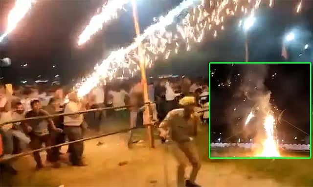 அப்போது, அந்த பொம்மையினுள்ளே பொருத்தப்பட்டிருந்த பட்டாசுகள் சிதறி வேடிக்கை பார்த்து கொண்டிருந்த பொதுமக்களை நோக்கி வரிசையாக பாய்ந்து வந்தன. இதைகண்டு பீதியடைந்த மக்கள், அதிலிருந்து தப்பிக்க ஓட்டம்பிடித்தனர். இதனால் அங்கு தள்ளுமுள்ளு ஏற்பட்டது. அங்கு பாதுகாப்புக்காக நின்றிருந்த போலீசாரும் செய்வதறியாமல் திகைத்தவாறு ஓடினர்.