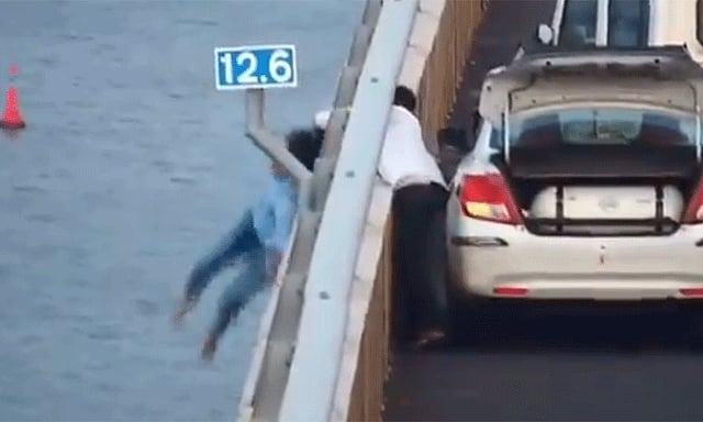 பாலத்தின் பாதுகாப்பு தடுப்பு மீது அந்த பெண் அமர்ந்திருந்தார். அப்போது அந்த பெண்ணின் அருகே, வாடகை கார் ஓட்டுநர் டிரைவர் நின்றுகொண்டிருக்கிறார். அவர், தற்கொலைக்கு முயற்சி செய்யும் பெண்ணிடம் ஏதோ பேசுகிறார். அதற்குள் அந்த பெண் பாலத்தில் இருந்து குதித்து விடுகிறார்.