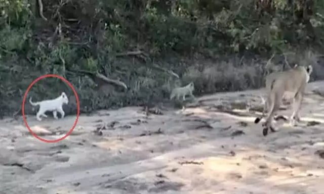 அந்த வீடியோவில், புதர்கள் மற்றும் பாறைகள் நிறைந்த காட்டுப் பாதையில் சிங்கம் ஒன்று கம்பீரமாக காட்டில் நடப்பதையும், அதன் குட்டிகள் அங்குமிங்கும் ஓடுவதையும் பின்தொடர்வதையும் கான முடிகிறது. குட்டிகளில் ஒன்று அபூர்வ வெள்ளை இனமாகும், இது தனது தாயைப் பின்தொடர்ந்து தனது உடன்பிறப்புகளுடன் ஓடி விளையாடி வேடிக்கையாக உள்ளது.