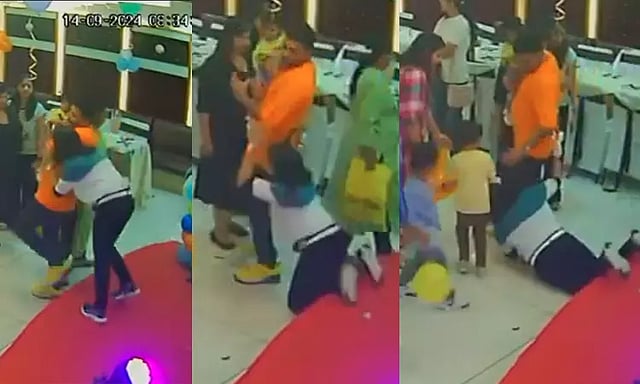 வல்சாத் மாவட்டம் வாபி நகரில் உள்ள சர்வாடா பகுதியில் வசிக்கும் தாவல் பரோட் - யாமினிபென் (37 வயது) தம்பதி தங்களது மகனின் 5-வது பிறந்தநாளை கடந்த 14-ந்தேதி சனிக்கிழமை அங்குள்ள ஒரு ஓட்டலில் கொண்டாடினர். மேடையில் தனது மகனுடன் குதூகலமாக இருந்த யாமினிபென் திடீரென மாரடைப்பு ஏற்பட்டு சரிந்து விழுந்தார்.