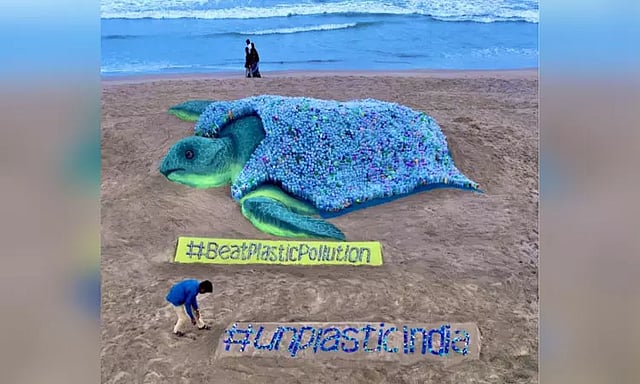 உலக சுற்றுச்சூழல் தினத்தையொட்டி ஒடிசாவைச் சேர்ந்த மணற்சிற்ப கலைஞர் சுதர்சன் பட்நாயக் பிளாஸ்டிக் மாசு குறித்து மக்களுக்கு விழிப்புணர்வு ஏற்படுத்தும் விதமாக பூரி கடற்கரையில் 2,320 பிளாஸ்டிக் பாட்டில்களைப் பயன்படுத்தி ஆமை வடிவ மணற்சிற்பம் வடிவமைத்துள்ளார். பிளாஸ்டிக் பாட்டில்களால் உருவாக்கப்பட்டுள்ள அந்த ஆமை பார்வையாளர்களை வெகுவாக கவர்ந்துள்ளது. அதில் "பிளாஸ்டிக் மாசுபாட்டை முறியடி" பிளாஸ்டிக் இல்லாத இந்தியா என்ற வாசகம் இடம்பெற்றுள்ளது. இந்த மணற்சிற்பம் சமூக வலைதளங்களில் வேகமாக பரவி வருகிறது.