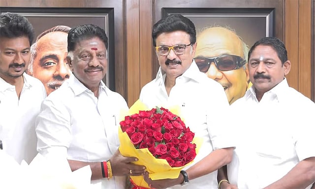 இந்நிலையில், முதல்-அமைச்சர் மு.க.ஸ்டாலினை ஓ.பன்னீர்செல்வம் சந்தித்து திமுகவில் தன்னை இணைத்துக்கொண்டார். அப்போது அவருக்கு முதல்-அமைச்சர் மு.க.ஸ்டாலின் சால்வை அணிவித்து வாழ்த்து தெரிவித்தார். ஓபிஎஸ் உடன் அவரது மகன் மற்றும் ஆதரவாளர்களும் திமுகவில் இணைந்து கொண்டனர். முன்னதாக அமைச்சர் சேகர்பாபு-ஓ.பன்னீர்செல்வம் இருவரும் ஒரே காரில் அண்ணா அறிவாலயம் வந்தது குறிப்பிடத்தக்கது.