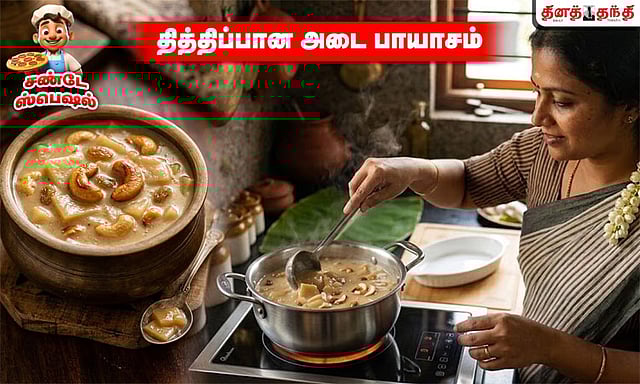 அடுத்து நெய்யை ஒரு பாத்திரத்தில் எடுத்துக்கொள்ளவும். பல் பல்லாக வெட்டிவைத்த தேங்காயை அதில் போட்டு பொன்னிறமாக வதக்கி எடுக்கவும். அதே நெய்யில் முந்திரி பருப்பை போட்டு பொன்னிறமாக வறுக்கவும். இரண்டையும் அடை பாயசத்துடன் சேர்க்கவும். ஏலக்காய் பொடியையும் சேர்த்து கிளறவும். தித்திப்பான, மணமான அடை பாயாசம் ரெடி.