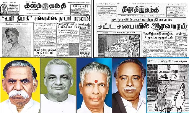 மாநில பிரிவினைகளுக்கு பின், சென்னை மாகாணத்தின் பெயரை 'தமிழ்நாடு' என மாற்ற வேண்டும் என்ற கோரிக்கை எழுந்தது. இந்த கோரிக்கையை வலியுறுத்தி விருதுநகர் மாவட்டத்தைச் சேர்ந்த பிரபல சுதந்திர போராட்ட வீரர் சங்கரலிங்கனார் 1956-ம் ஆண்டு ஜூலை 26-ந் தேதி காலவரையற்ற உண்ணாவிரத போராட்டத்தை தொடங்கினார். 76 நாட்கள் உண்ணாவிரதம் இருந்த நிலையில் அவர் மரணம் அடைந்தார்.