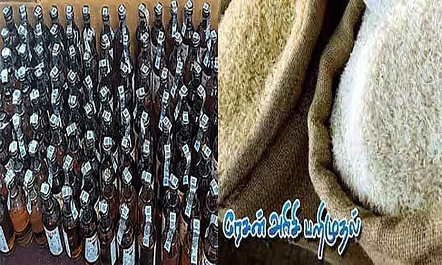 போலீசார் நடத்திய சோதனையில் அந்த வீட்டில் பெட்டி பெட்டியாகப் பதுக்கி வைக்கப்பட்டிருந்த 263 மதுபான பாட்டில்கள் கண்டெடுக்கப்பட்டன. மேலும் அடுத்த அறையில் தலா 50 கிலோ எடை கொண்ட 20 மூடை ரேஷன் அரிசி (மொத்தம் 1,000 கிலோ- 1 டன்.) பதுக்கப்பட்டிருந்தது கண்டுபிடிக்கப்பட்டது.