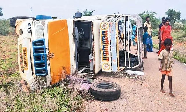 திருவள்ளூர் மாவட்டம், ஊத்துக்கோட்டை அருகே உள்ள பாலவாக்கத்தில் உள்ள சிறுணை கிராமத்தைச் சேர்ந்த தொழிலாளர்கள் சிலர் அருகே உள்ள பெரம்பூர் கிராமத்தில் உள்ள பூந்தோட்டத்துக்கு பூப்பறிக்கச் சென்றனர். இவர்கள் நேற்று முன்தினம் மாலை வேனில் ஊருக்கு புறப்பட்டனர். சிறுணை கிராம எல்லையில் திடீரென கட்டுப்பாட்டை இழந்த வேன் சாலையோர பள்ளத்தில் கவிழ்ந்தது. வேன் டிரைவர் தப்பி ஓடிவிட்டார்.