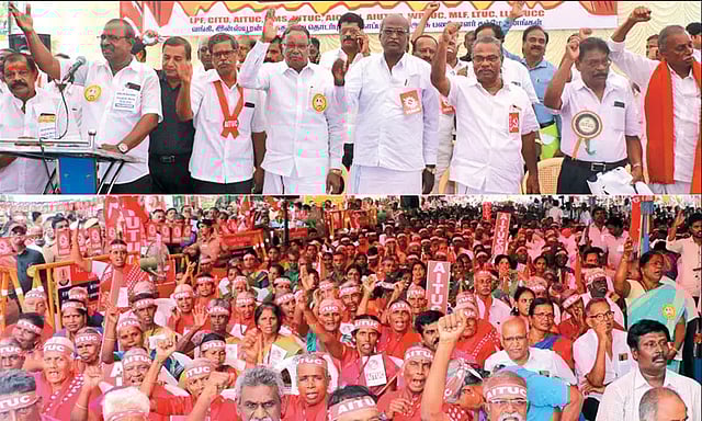 இந்த ஆர்ப்பாட்டத்தில், சி.ஐ.டி.யூ. மாநிலத்தலைவர் சவுந்தரராஜன், ஏ.ஐ.டி.யூ.சி. பொதுச்செயலாளர் ராதாகிருஷ்ணன், உழைக்கும் மக்கள் மாமன்றத்தின் தலைவர் குசேலர், எம்.எல்.எப். தலைவர் அந்திரிதாஸ் உள்ளிட்ட பலர் கண்டன உரையாற்றினர்.