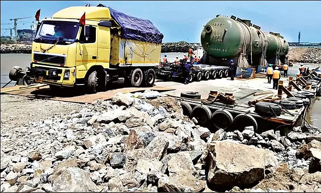 தொடர்ந்து அந்த சாலை வழியாக நேற்று மதியம் அதிநவீன ஹைட்ராலிக் வசதியுடன் கூடிய 128 டயர்களைக் கொண்ட ராட்சத லாரி மெதுவாக பயணித்து மிதவை கப்பலை சென்றடைந்தது. மிதவை கப்பலில் இருந்த 2 நீராவி ஜெனரேட்டர்களையும் ஒவ்வொன்றாக மீட்கும் பணி நடைபெற்றது.