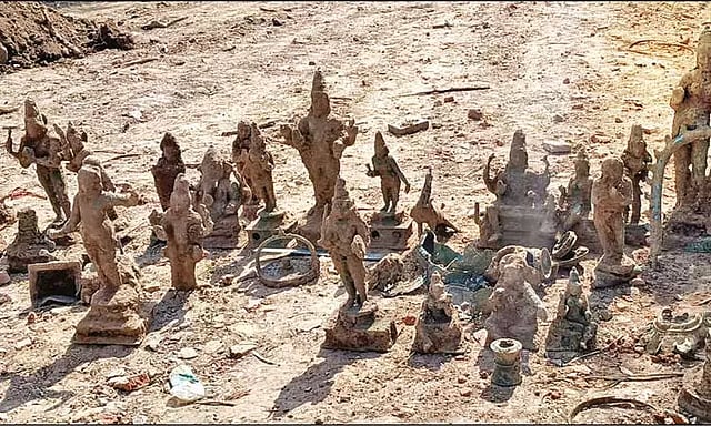 இதனால் கோவில் நிர்வாகத்தினர் சிலைகள் மற்றும் பூஜை பொருட்களை கண்டெடுக்கப்பட்ட பொருட்களை பாதுகாப்பாக கோவில் வளாகத்துக்குள் வைத்துள்ளனர்.