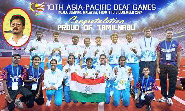 மலேசியாவில் நடைபெற்ற 10-வது ஆசிய பசிபிக் காதுகேளாதோர் விளையாட்டு போட்டி 2024-ல் தமிழ்நாட்டைச் சேர்ந்த 12 மாற்றுத்திறனாளி விளையாட்டு வீரர், வீராங்கனையர் வெவ்வேறு விளையாட்டுக்களில் 6 தங்கம், 13 வெள்ளி, 5 வெண்கலம் என மொத்தம் 24 பதக்கங்களைக் குவித்து சாதனை படைத்துள்ளனர்.