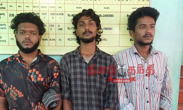 இதையடுத்து அவர்களை போலீஸ் நிலையம் கொண்டு வந்து விசாரணை நடத்தினர். அப்போது அவர்கள் கேரள மாநிலம் கொல்லம் மாவட்டத்தை சேர்ந்த மன்சூர் மகன்கள் செய்யதலி (வயது25), மாகின் (21) மற்றும் ஷனோபரின் மகன் பர்ஜாய் (20) என்பது தெரிய வந்தது.