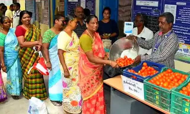 இந்த நிலையில், முதல்-அமைச்சரின் உத்தரவின் படி தமிழ்நாடு முழுவதும் விரிவுபடுத்தும் வகையில் மொத்தம் 302 ரேஷன் கடைகளில் தக்காளி விற்பனை தொடங்கி உள்ளது. தக்காளி அதிகம் வராததால் 1 நபருக்கு 1 கிலோ என்ற அளவில்தான் 60 ரூபாய்க்கு ரேஷன் கடைகளில் விற்பனை செய்யப்படுகின்றன. சென்னையில் காஞ்சிபுரம் மாவட்ட நுகர்வோர் கூட்டுறவு மொத்த விற்பனை பண்டக சாலைக்கு உட்பட்ட ராமாபுரம், மடிப்பாக்கம், போரூர், வளசரவாக்கம், மதுரவாயல் லட்சுமி நகர், வானகரம், கந்தன்சாவடி, காரப்பாக்கம் ரேசன் கடைகளில் தக்காளி விற்கப்படுகிறது.