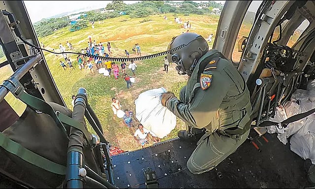அந்த கிராமத்தில் அவசர மருத்துவ உதவி தேவைப்பட்ட முதியோரையும், கர்ப்பிணி பெண்ணையும் 'ஹெலிகாப்டர்' மூலம் இந்திய கடற்படை வீரர்கள் நேற்று மீட்டனர். பின்னர் அவர்கள் சிகிச்சைக்காக தூத்துக்குடி ஆஸ்பத்திரியில் அனுமதிக்கப்பட்டனர்.