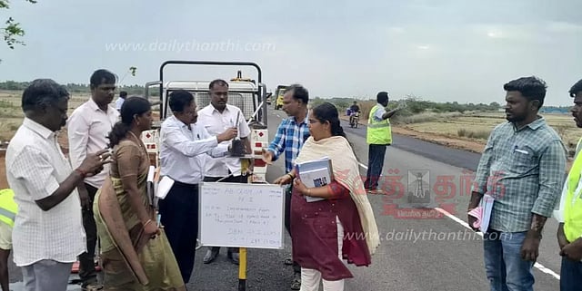 தஞ்சை மாநகரில் போக்குவரத்து நெரிசலை குறைக்கும் வகையில் புறவழிச்சாலை அமைக்கப்பட்டது. இந்த புறவழிச் சாலை 2 கட்டமாக மேற்கொள்ளப்பட்டது. அதன்படி 2-வது கட்டமாக தஞ்சை புதிய கலெக்டர் அலுவலகம் அருகே இருந்து பள்ளியக்ரஹாரம் ரவுண்டானா வரை 14 கி.மீ. தூரம் பணிகள் மேற்கொள்ளப்பட்டன. இந்த சாலை பயன்பாட்டில் இருந்து வரும் நிலையில் இதனை மேலும் அகலப்படுத்தும் பணிகள் மேற்கொள்ளப்பட்டன. அதன்படி முதல்கட்டமாக 9 கி.மீ. தூரம் அகலப்படுத்தும் பணிகள் மேற்கொள்ளப்பட்டன. அதனைத்தொடர்ந்து மீதமுள்ள 5 கி.மீ. தூரம் உள்ள பணிகள் நடைபெற்றுள்ளன.தஞ்சையை அடுத்த சக்கரசாமந்தம்- பள்ளியக்ரஹாரம் இடையே நெடுஞ்சாலைத்துறை சார்பில் மேற்கொள்ளப்பட்டுள்ள இந்த பணிகள் உரிய தரத்துடன் முறையாக நடைபெற்றுள்ளதா? என சென்னையில் உள்ள நெடுஞ்சாலைத்துறை தலைமை பொறியாளர் சந்திரசேகர் நேரில் ஆய்வு மேற்கொண்டார். அப்போது அவர் அகலப்படுத்தும் பணிகளின் அளவு, தார் முறையாக போடப்பட்டுள்ளதா? எனவும் பரிசோதனை செய்து ஆய்வு மேற்கொண்டார். இந்த ஆய்வின் போது தஞ்சை கோட்ட பொறியாளர் செந்தில்குமார், உதவி கோட்ட பொறியாளர் கீதா, தரக்கட்டுப்பாட்டு உதவி கோட்ட பொறியாளர் தமிழழகன், உதவி பொறியாளர்கள் மோகனா, செல்வகுமார், ஒப்பந்த பணி மேற்பார்வையாளர் திருமாறன் மற்றும் அதிகாரிகள் உடன் இருந்தனர்.