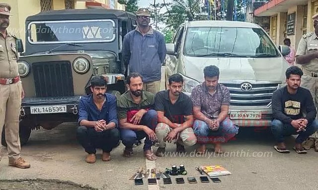 அதில் அவர்கள் பந்தலூர் தாலுகா பொன்னானியை சேர்ந்த ஜோபின்(வயது 28), கேரள மாநிலம் மலப்புரம் மாவட்டம் மஞ்சேரியை சேர்ந்த ஜெம்சீர்(37), வழிக்கடவை சேர்ந்த ஜிஜோ(30), ஜபின் ஜான்(30), கவனூரை சேர்ந்த முகமது ஆனில்(33) ஆகியோர் என்பது தெரியவந்தது. அவர்களிடம் கூடலூர் கோட்ட வன அலுவலர் கொம்மு ஓம்காரம், உதவி வன பாதுகாவலர் கருப்பையா, வனச்சரகர்கள் ராதாகிருஷ்ணன், வீரமணி, சுரேஷ் ஆகியோர் தனித்தனியாக விசாரணை நடத்தினர். அதில் அவர்கள் வனவிலங்குகளை வேட்டையாட முயன்றதை ஒப்பு கொண்டனர்.