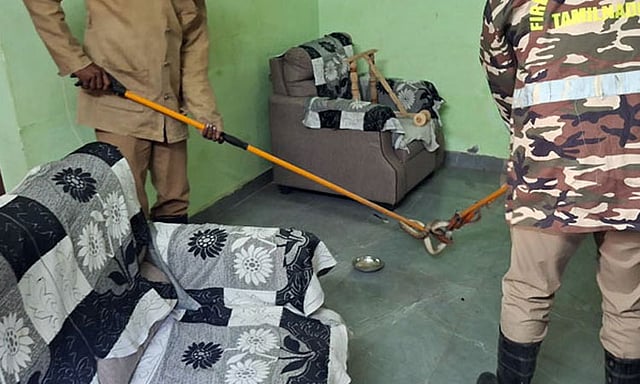 தகவலின் பேரில், தீயணைப்பு நிலைய அலுவலர் கார்த்திகேயன் தலைமையில் வீரர்கள் சம்பவ இடத்திற்கு விரைந்து சென்றனர். அங்கு சோபாவின் அடியில் பதுங்கியிருந்த சுமார் 6 அடி நீளமுள்ள சாரைப்பாம்பை லாவகமாகப் பிடித்தனர்.