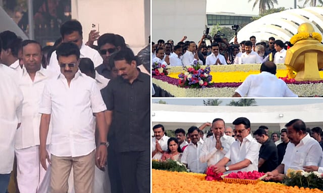 இந்த நிலையில், பிறந்தநாளையொட்டி மெரினா கடற்கரையில் அமைந்துள்ள அண்ணா, கருணாநிதி ஆகியோரது நினைவிடங்களுக்கு சென்ற முதல்-அமைச்சர் மு.க.ஸ்டாலின் மலர் வளையம் வைத்து மரியாதை செலுத்தினார். அப்போது துணை முதல்-அமைச்சர் உதயநிதி ஸ்டாலின், அமைச்சர்கள், திமுக எம்.பி.க்கள், எம்.எல்.ஏ.க்கள், மற்றும் நிர்வாகிகள் உடனிருந்தனர்.