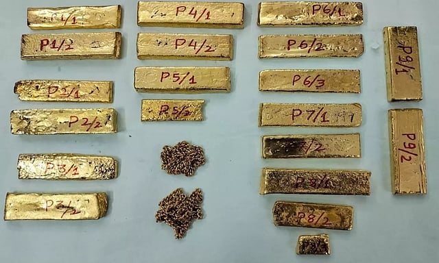 பஸ்சில் சந்தேகப்படும் வகையில் இருந்த தம்பதி உள்பட 3 பேரை பிடித்து விசாரணை நடத்தியதில் முன்னுக்குப்பின் முரணாக பதில் அளித்தனர். அவர்கள் கொண்டுவந்த பையை சோதனை நடத்தியதில் 9 கிலோ 765 கிராம் தங்க கட்டிகள் இருந்தது. மேலும் 6 லட்சம் ரொக்க பணமும் இருந்தன. இதையடுத்து அதிகாரிகள் அவைகளை பறிமுதல் செய்தனர்.பறிமுதல் செய்யப்பட்ட தங்கத்தின் இந்திய ரூபாயின் மதிப்பு 5 கோடியே 89 லட்சத்து 66 ஆயிரம் ஆகும். மேலும் தம்பதி உள்பட 3 பேரையும் அதிகாரிகள் கைது செய்தனர்.