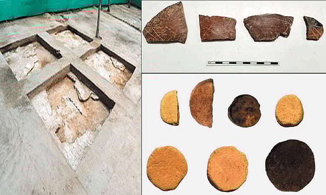 கருப்பு, சிவப்பு ஓடுகள், பானைகள், விலங்கு உருவ பொம்மைகள், பாம்பு உருவ சுடுமண் பொம்மை, படிகத்தால் செய்யப்பட்ட எடைக்கல், தங்க ஆபரணங்கள், சில்லு வட்டுக்கள், கண்ணாடி பாசிமணிகள், தாயக்கட்டைகள் உள்பட 700-க்கும் மேற்பட்ட பொருட்கள் கண்டெடுக்கப்பட்டன.