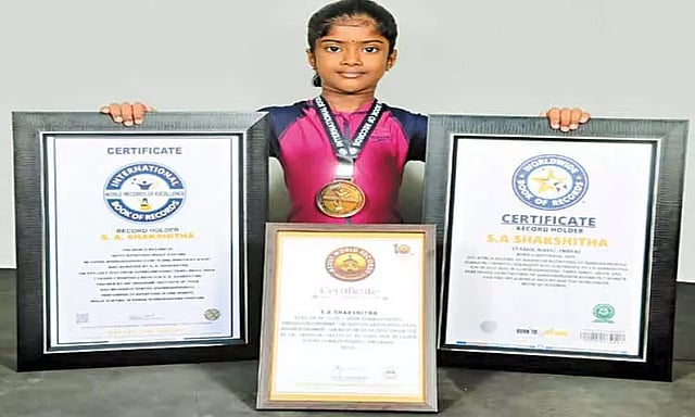 கும்மிடிப்பூண்டியை சேர்ந்த அரசு, ஷோபனா தம்பதியரின் மகள் ஷாக்ஷிதா. 7 வயதான இவர் தனியார் பள்ளியில் 3-ம் வகுப்பு படித்து வருகிறார். இவர், கண்டபேருண்டாசனம் என்னும் யோகாசனத்தில் நின்றபடி, ஒரு நிமிடத்தில், 25 முறை சுழன்று உலக சாதனை படைத்தார்.